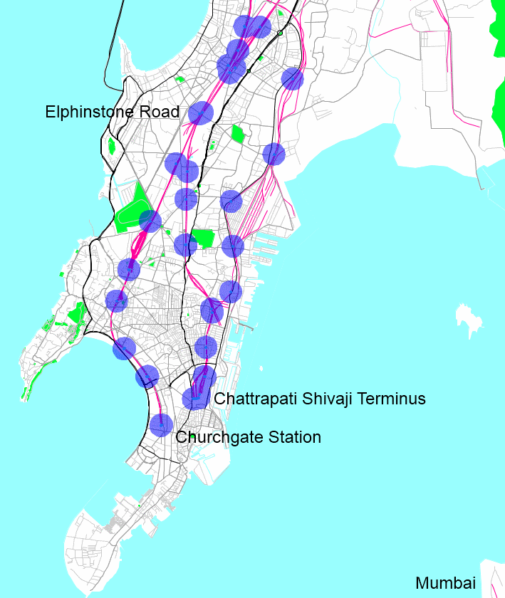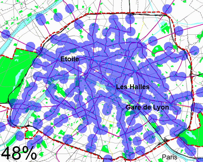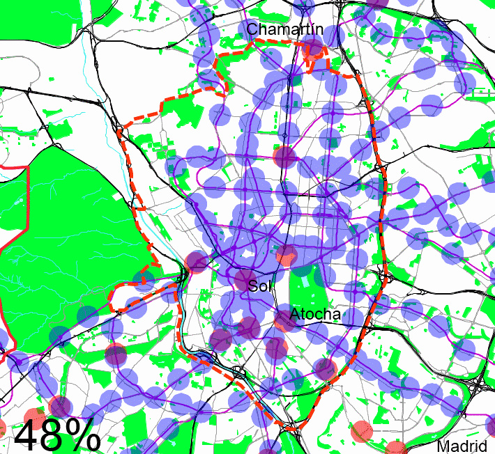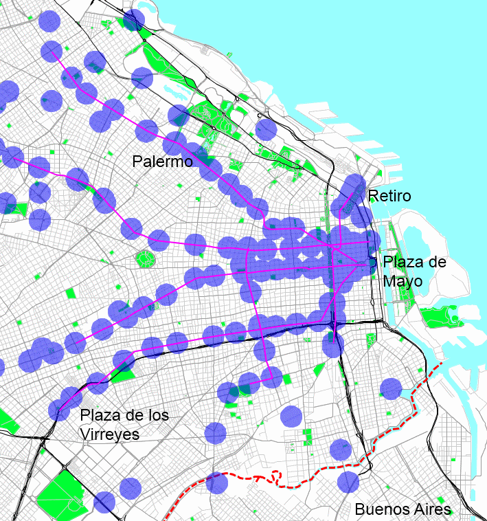 As in most rapid transit systems, it is focused on core- periphery relations; the network extensions have reinforced the nodal role of the historical city core through the links among confluent lines. Not having a fixed limit for the core center, and taking as a reference the limit of the scope of the Proyecto Madrid Centro, 48% of that area is at less than 300 m of a metro station. That figure is similaire to that in Paris; Manhattan seems to present a similar figure. Mumbai, a city that plans to introduce a rapid transit system in the next years, uses the rail network as the backbone of its public transportation system, with a less dense coverage. Buenos Aires combines a low density rapid transit network with the railroads. The following maps show the described networks of those cities at the same scale, as well as the 300 m radius from the stations.