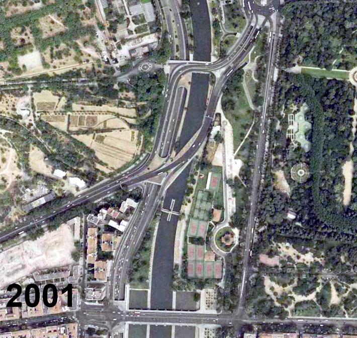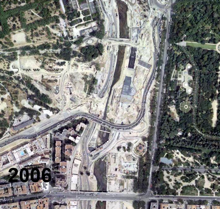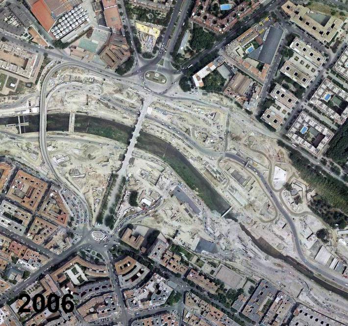 I have just seen that Madrid’s regional cartography portal (nomecalles) has put online a 2011 ortophotography, which helps to better perceive the transformation of the M30 inner beltway between 2004 and 2011 (which was described in the urban freeways-1 post). Just get a look to three areas in which this is quite clear. The 2006 photos show how complex were the provisional road diversions during works.