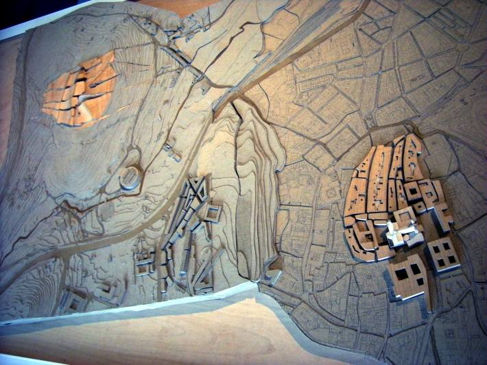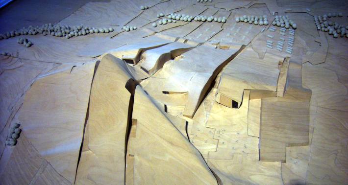Along with the traditional spaces in Santiago de Compostela there is the Ciudad de la Cultura, a new element that in part tries to emulate the tourist success of a similar initiative, the Guggenheim Museum in Bilbao. In 1999 the regional government launches an international architectural competition, won by american Peter Eisenman. The proposed project, on a nearby hill, is disconnected from the continuous urban tissue, and covers an area (677.000 sq m) nearly as large as the whole old city, reproducing partially the original elevation.