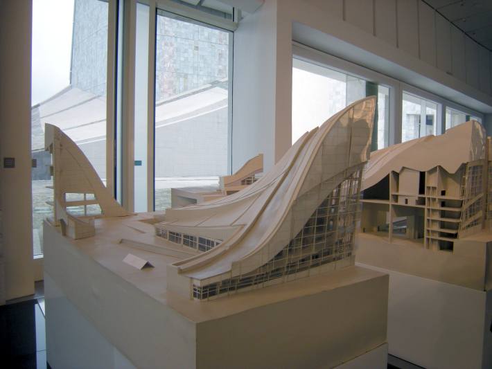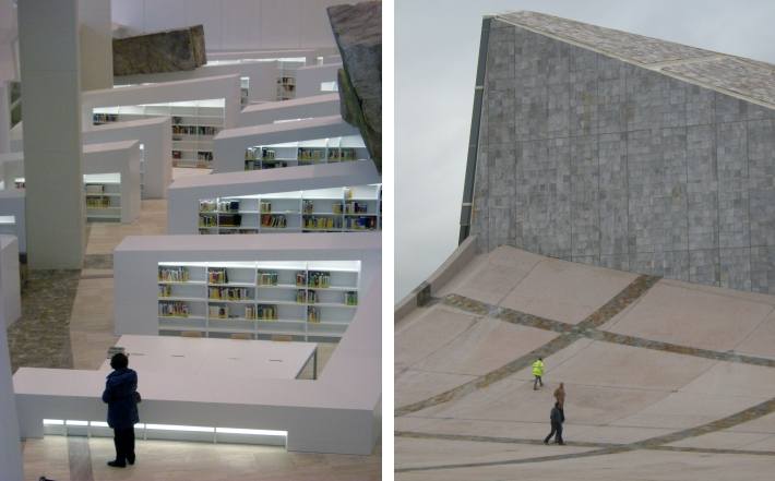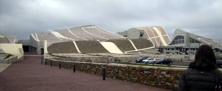 The architecture of the Ciudad de la Cultura in Santiago de Compostela is defined by large volumes of a complex geometry, finished with granite fixed to a complex metallic structure. The overall aspect is mineral.