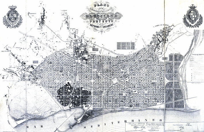In 1858 and 1860 the Barcelona and Madrid demolition acts are approved. In Barcelona there is a conflict between state and city, as the first imposes Cerda’s project; this bears the name “ensanche” (widening), since then a generic name for city extensions. The regular grid is not a revolutionary layout, as it was a norm for newly founded American colonial cities of the Spanish empire; innovation was clearer for its theoretical framework, a comprehensive review of all the technical considerations associated to urban growth, clearly related formal issues and a social reform agenda less radical than in other examples but nevertheless new in approach. The public works minister, Pascual Madoz, introduced land management procedures that allowed demolishing the walls by an anticipated sale of future building rights. This contrasts with Paris, which retains its walls until 1919 due in part to the presence of open spaces inside, or Vienna, where the Ring also generates a new urban tissue but on a more reduced scale. Madrid and Barcelona get a planned growth instrument with larger territorial ambitions.