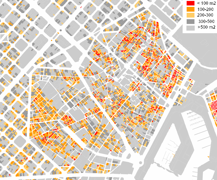Cadastral map of the old city of Barcelona in 2012 and lot area in sq m. Despite the 150 years pased since Cerda’s plan enactment and many transformation operations, there is still a large proportion of small lots and the old middle ages urban fabric is still visible, marked by some street openings planned by Cerdá, as the Via Laietana.