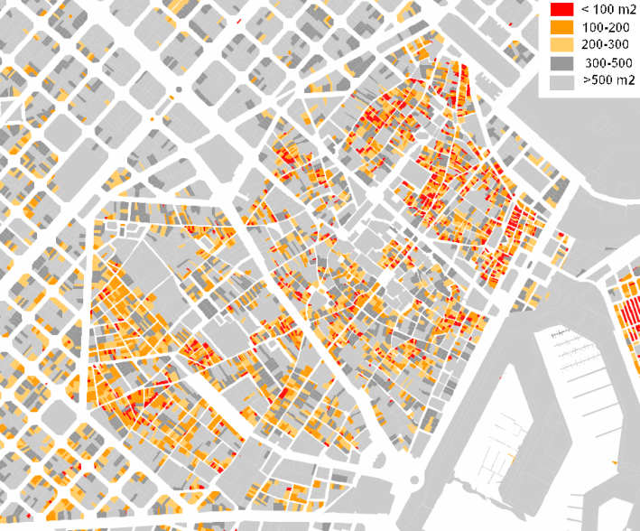 Cadastral map of the old city of Barcelona in 2012 and lot area in sq m. Despite the 150 years pased since Cerda’s plan enactment and many transformation operations, there is still a large proportion of small lots and the old middle ages urban fabric is still visible, marked by some street openings planned by…