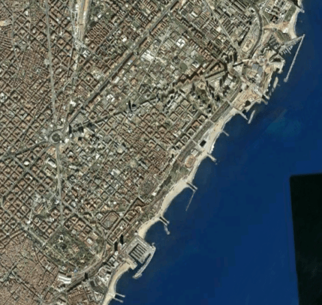When Cerdá conceives his ensanche in 1859 on the plains surrounding the old city on the north and west, the northern seashore is integrated. The ensanche takes about a century to cover, but this happens in an unbalanced way; while the trace is quite respected (albeit highly densified) on the area closest to the old city, in the northern areas it is modified and more often industrial than residential. The main lines of the grid can also be seen ther, but the continuity of the pattern is compromised in areas, the plaza de las Glorias does not reach the potential civic center status devised by Cerdá and the beachs are mere marginal areas.