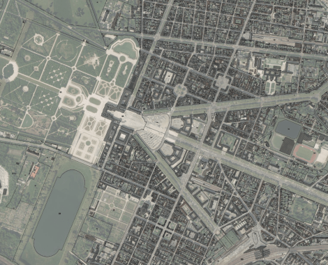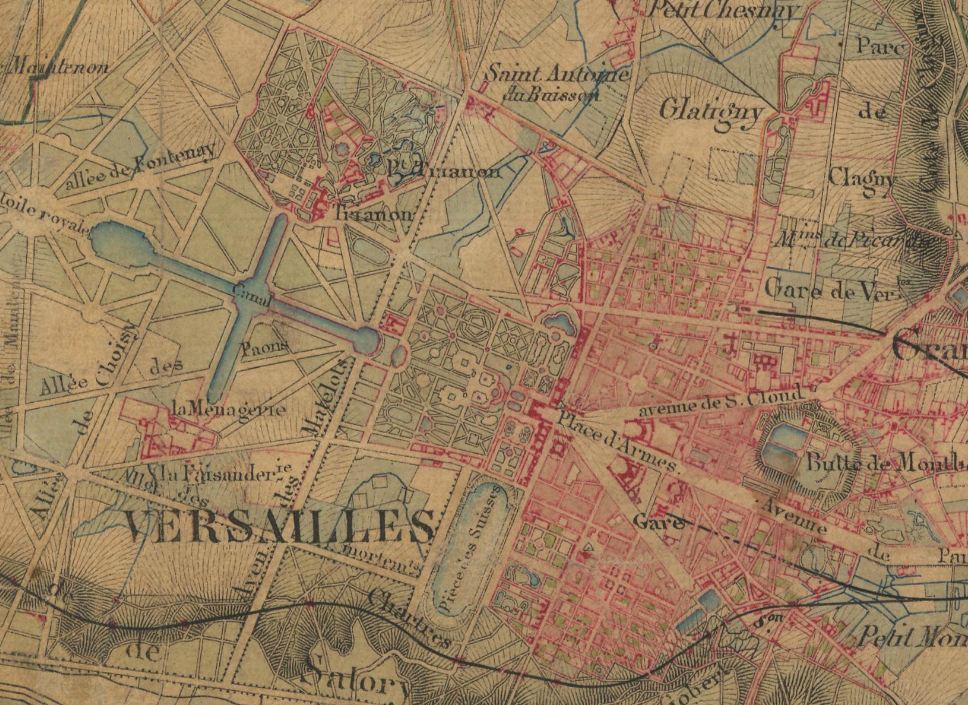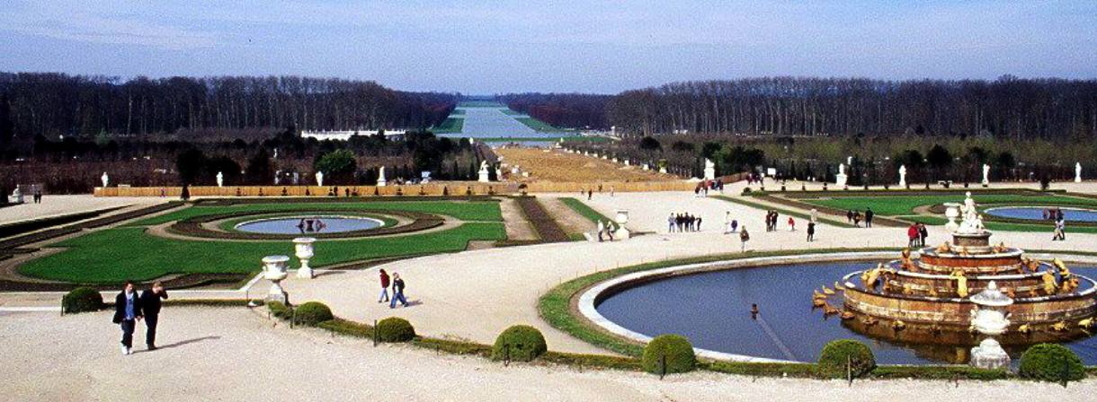 The Avenue de Paris is the main central urban axis, linking the palace to the old road to Paris, and organizing the formal composition of both the city and the gardens. The garden’s layout is conditioned by a large cross shaped pond, whose main axis extends that of the Avenue de Paris. This continuity of the axis was not visible when it was built, as the Palace is set as perpendicular to that axis.