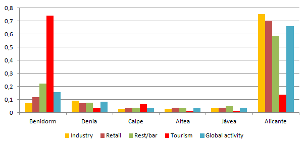The economic relevance of each sector is estimated according to data from the Anuario Económico de España 2012 from La Caixa. The following graph shows the relative weight of each sector, and, for comparative background, the situation in Alicante, the provincial capital (population over 300.000). Benidorm is clearly singular due to the hotel concentration.