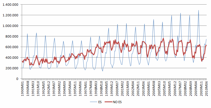 The analysis of the night stays in hotels on the Alicante coast (in which these municipalities are included) shows that each year Spanish tourists represent closet o 60% of all hotel nights, the rest corresponding to foreigners. The evolution by month shows that foreigners fluctuate less, while Spaniards concentrate in summer. Although in 2011 the hotels concentrated in the whole of Spain 73,6% of all night stays, these data cannot be directly extrapolated to the whole of tourism activities, as rental apartments and homes and apartments owned by tourists can have different dynamics, there are zonal specificities and there is also an unregistered tourism lodging offer.