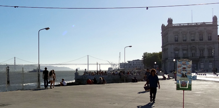 The fact of having been the capital of a world empire, liquidated by the carnation revolution in 1975, and the traces of that old splendor as seen in a context in which unfortunately decadence is in some areas beyond poetics, marks the city. Old trams have survived in a large measure due to the fact that the city lacked some modernizing waves that were present in other parts of Europe, to become today a tourism asset, and a sustainable mobility one too. The persistence of the traditional paving on sidewalks is in part the result of the resilience of a costs structure in the public works that no longer exists in other areas. On the other side, the 25 de abril bridge as seen from the Praça do Comercio configures an interesting metropolitan landscape.