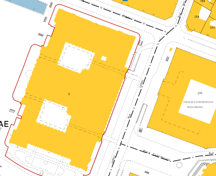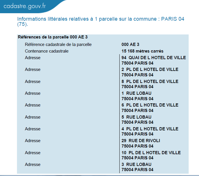Cadastral image of the Paris Hotel de Ville and its surounding areasCadastral data for the Hotel de Ville (a single lot covering the whole block)