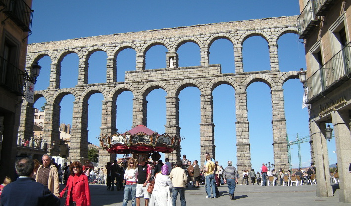 Segovia (pop. 55.748 in 2010) is one of the most interesting cities in Spain in terms of historical heritage. The historical core is located on and around a large rock between two valleys on the northern slope of the Sierra de Guadarrama range. Just about an hour from Madrid by car and some 30 minutes by high speed train, it is a nice trip if you visit Madrid. The City represents some of the finest examples of the midle ages and renaissance architecture in the country; altough it has a magnificent roman aqueduct still working, the roman city that was served by it is less well known.