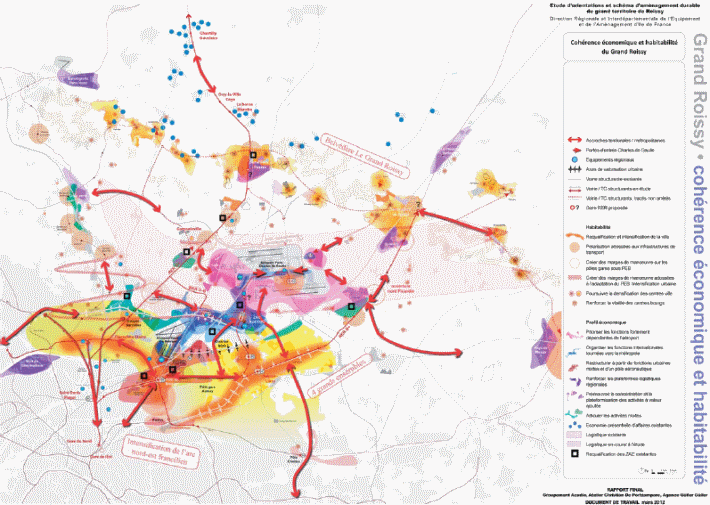 Roissy- Charles de Gaulle airport, north of central Paris, is one of the main economic assets of the metropolitan area, and it is one of the project territories of the SDRIF 2012. Well linked to the metropolitan core and northern areas, it is less well connected to the west and east. The regional scale challenges are to find a balance between economic and residential development, to tackle the differences between a powerful economic scene and the social weaknesses, and to avoid a capacity overflow in roads.