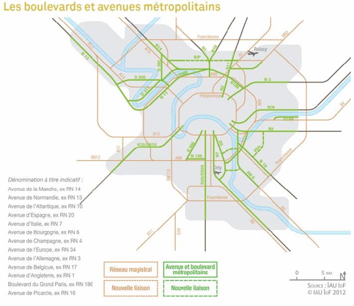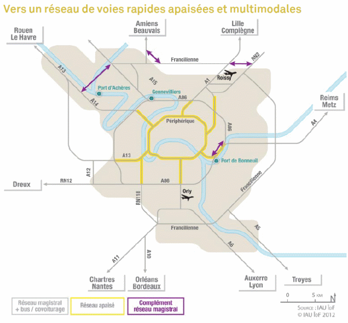 - Traffic calming on the Peripherique and the initial sections of the radial freeways, as well as a special treatment for metropolitan boulevads and avenues. Even if there are projects for some freeway links (for instance, Roissy Beltway), they are not the main issue. The multimodal use of the freeways, introducing high occupancy and transit reserved lanes (as on Madrid’s A6), is presented as the new normal. Traffic calming should also allow new uses in the current no-build zone around freeways, allowing bus stations and other facilities. It is one of the most relevant ideas of the SDRIF in environmental terms, as it would reduce greenhouse gas emissions