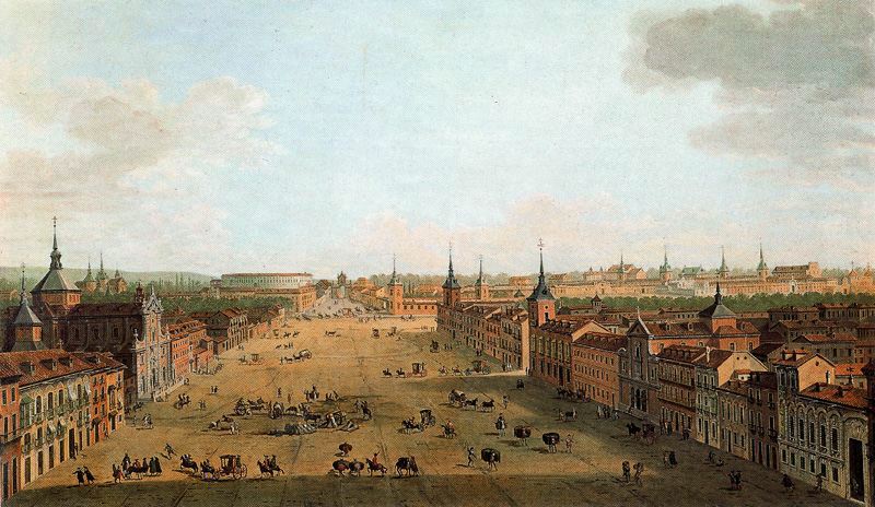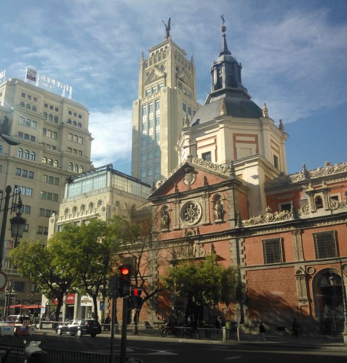The Calatravas Church is what remains from the old Concepción Real Covent (1670-1678), in Calle Alcalá 25, neart the Puerta del Sol. In 1750 the italian painter Antonio Joli did not show the church itself, but the painting shows how the domes and spires of noteworthy buildings compared in terms of scale with the rest of the buildings. During the early XXth century Madrid became a quite american- like city in terms of architecture, mostly due to the nearby Gran Via project, and heigths reached new limits, as the few remaining XVIIth century buildings lost their preponderance to others that, sometimes, had also a good architecture. On the background you can see a svelte tower (less than 200 sq m per floor, with a side under 15 m), initially built for the La Unión y El Fénix insurance company (to which Spanish cities owe many buildings in relevant places around the same time), and today converted into the Petit Palace Alcalá Torre Hotel. Even if its clear that this tower is not a dome, it has the same spirit to “show the head”, in this case through sveltesse (proportions are more relevant than dimensions…)