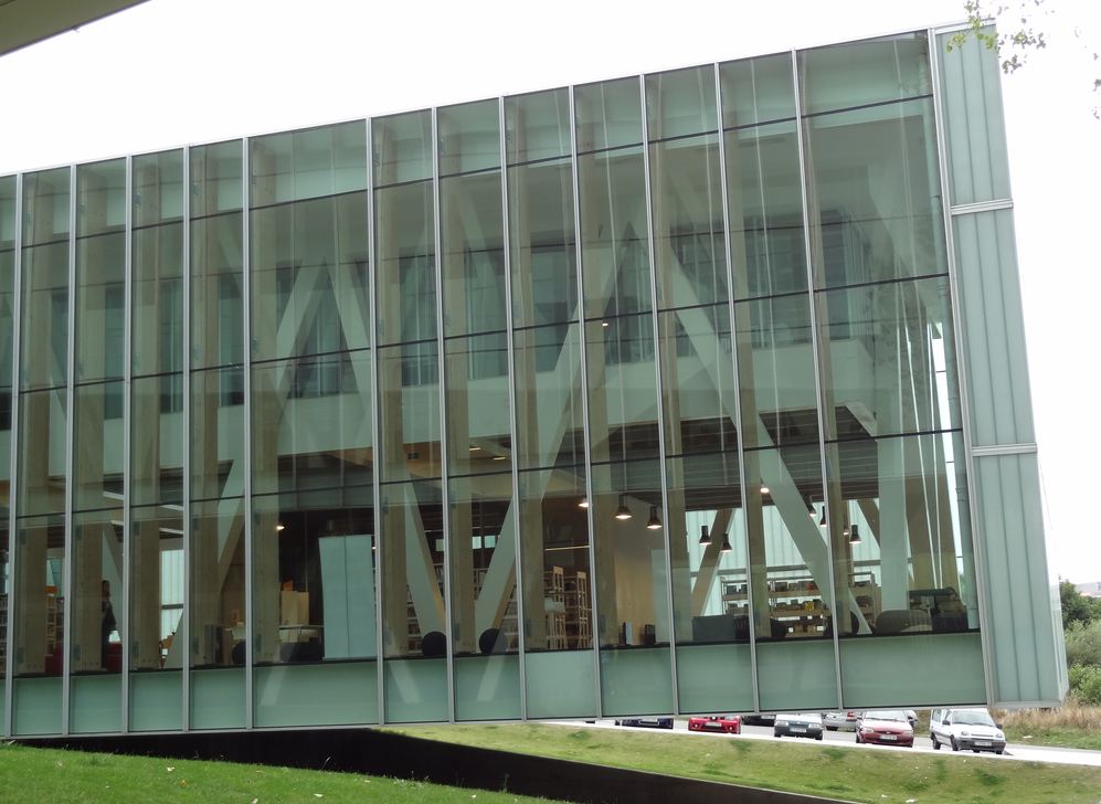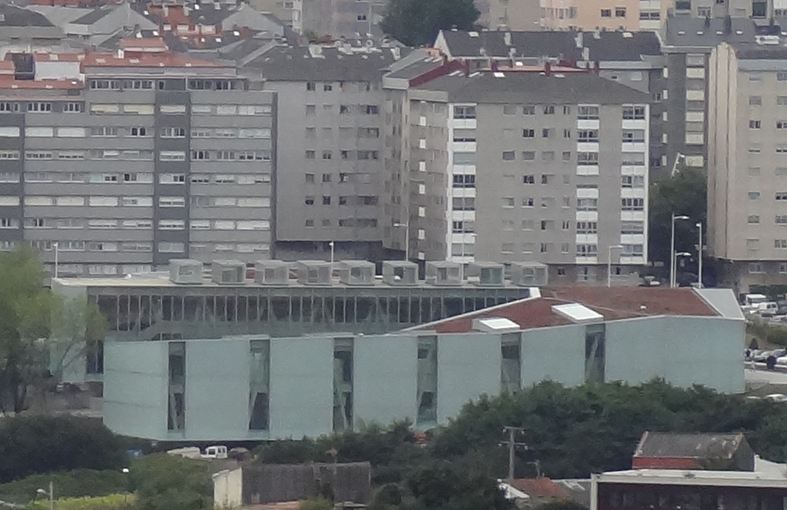 The Agora is a recently opened civic center in the Ronda de Outeiro area, in La Coruña. Iit covers one of the densest neighborhoods in what is one of the denser Spanish cities. The project (by Rojo+Fernandez Shaw arquitectos) uses the land slope to create an interesting multilevel architecture, in which the library is on a side wing, suspended over the garage entrance.