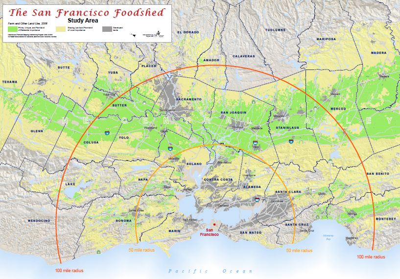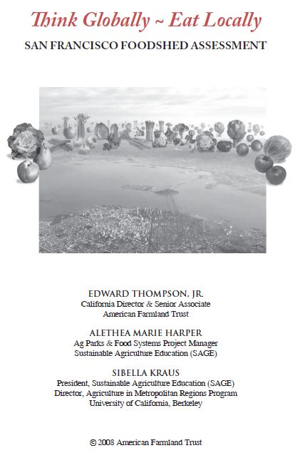 The Think globally- eat locally – San Francisco Foodshed Assessment study starts by asking if the city of San Francisco (not the entire Bay Area) could feed itself with local food produced within 100 miles of the Golden Gate. It identifies a production of 20 million tons of food per year, as compared to 935.000 tons consumed in San Francisco and 5,9 in the whole Bay Area. But for eggs, citrus fruit, wheat, corn, pork and potatoes, the food produced whithin the 100 miles range would be enough to current demand, altough in some cases seasonality would be a problem.