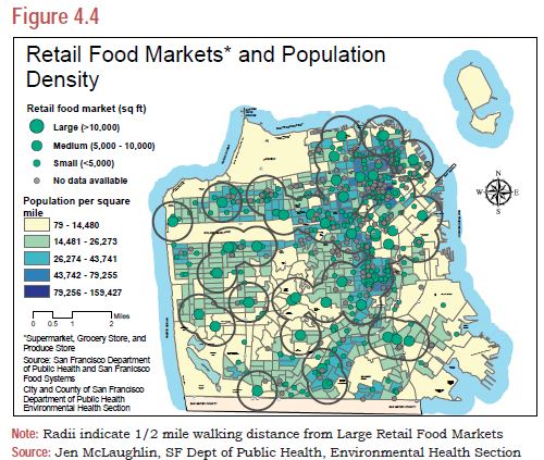 But it is not possible to know the actual proportion of local food consumed today in the city or the Bay Area. Irrigated croplands into the aforementioned circle are just 18% of total farmland, but produce 3/4 of the agricultural value; these irrigated areas are threatened by urban growth, at a rate of an acre for each 9,7 residents (a bit less than 25 residents per hectare). Food traceability should be encouraged.