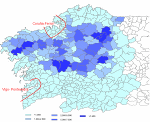 Number of milk cows in the Galician municipalities in 2010. The two main metropolitan areas are outlined