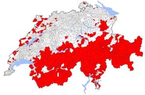 En rojo, municipios suizos en los que se presume que el número de residencias secundarias supera el 20% de las viviendas totales