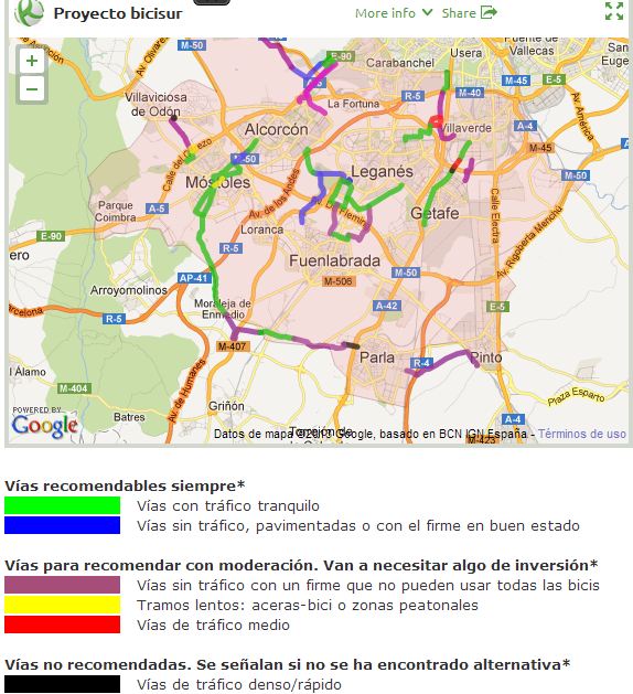On the metropolitan scale the situation is far from easy; the Bicisur project is led by the Consorcio de Transportes (the regional transportation authority) to make the bike a real alternative to mass transit and private cars in southern metro madrid, along the metrosur line (a curious subway ring that is in an excentric situation).
