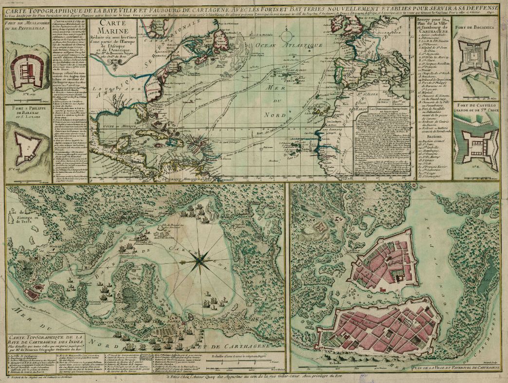 The walls, whose cost to the crown was widely commented, still exist for the most part, as well as some forts around, as the San Felipe de Barajas Castle. The two main islands are today united, and the colonial architecture can still be seen, mixed with more recent elements. When you compare the old map with the current image, please note that the former represents the west in the lower part of the image.