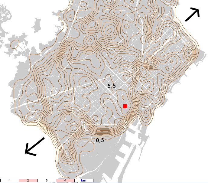 In Barcelona you can see that the most common density in the urban core is 5,5 (substantially higher than that devised by Cerdá in his 1860 extension plan). The city has an urban tissue whose density is quite homogeneous, surrounded as it is by mountains and the sea and as the core of a larger metropolitan area.
