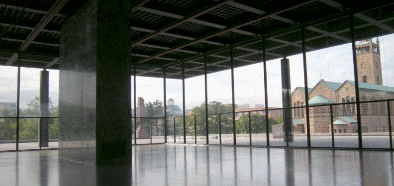 In Berlin, on the other side, the combined surface of both Spanish squares is covered by … well, a square slab, supported on eight steel columns (the building has a larger basement, but it is scarcely visible from the outside, its presence resting on the upper part). The building, by the great master Mies Van der Rohe, is a space whose enclosure is defined first by the large slab itself, and also by a glass curtain on an inner position. There are no obstacles to view the outside and, for instance, Sankt Matthaus church, the Philarmonie or the Sony Plaza. When I visited the Galerie in 2011, it was empty but for a large cylindrical installation. The building is elegant in proportions, but so nude of ornament that any rust mark or any reminder of the complexity of reality is simply too apparent. Opose that to the Santiago squares, all with a granite which has suffered the passage of time. As in the case of the large ships carrying oil derricks, this a matter of a play of spaces and scale relations, in each case with a different result.