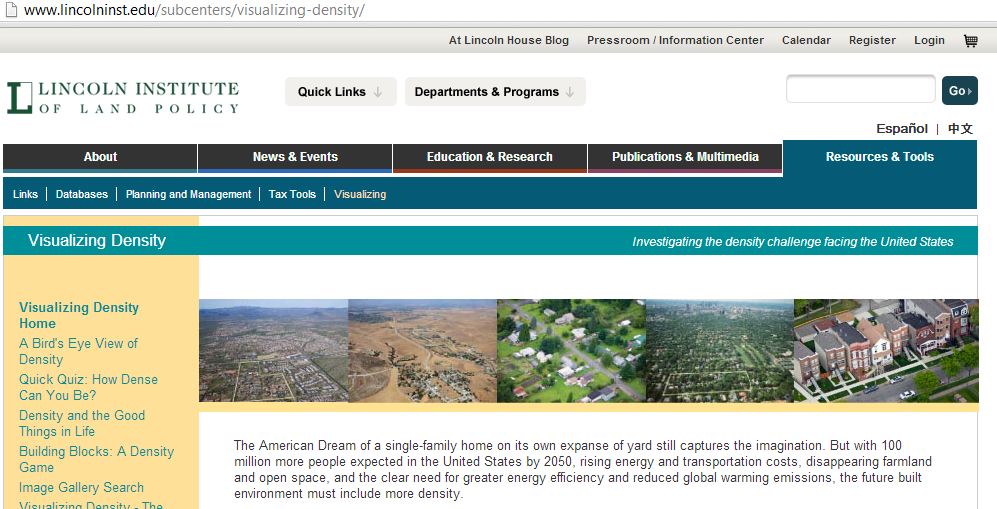 The french study being more technical, the “visualizing density” project of the Lincoln Institute is a book by Julie Campoli and Alex S. MacLean with a more didactic vocation, which also has a serious background and rigurous development. In this case, you cannot download the full book, but the microsite has a lot of content and you cand download the first chapter if you register (free)