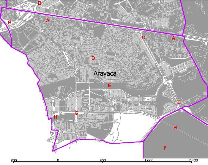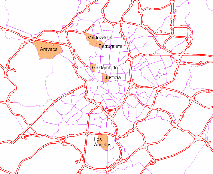 Aravaca is somehow defined by its recent evolution from an out-of-town area with some second homes from the beguining of the XXth century, due to its accesibility through the La Coruña road (today A6, A-A on the map) and the Castille road (C-C on the map), reinforced in the last decades by the M-40 orbital (B-B) and the upgrade of the rail line (H-H, with station on G); the Casa de Campo, a former royal hunting ground (F) also contributes to define the space. The original village (D) has some retail functions in a denser setting, but most the area is low density, and some landscape provisions, as green corridor around the Arroyo de Pozuelo (E) contribute.