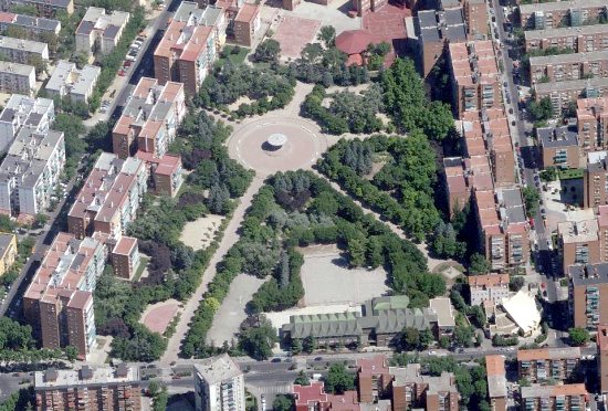 Ciudad de Los Angeles is representative of the urban growth in southern Madrid during the boom economics of the 1960s and 1970s. The area grew due to employment in the automotive industries (A) and other industrial and military activities, taking advantage of its location by the trunk highway to Andalucia (B-B) and the presence of railways. More recently, the area has been subject to the presence of the M-40 orbital freeway (C-C). The central park (D) is the most relevant open space. The density of the Barrio is “artificially” low as compared to its built form, as the old industrial and military compounds, in many cases already vacant, are into the administrative boundary.