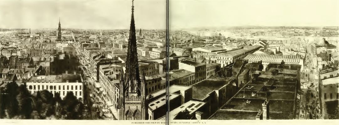 The view from the roof of Trinity Church in 1848, which shows a city that is still European for heights and general layout.