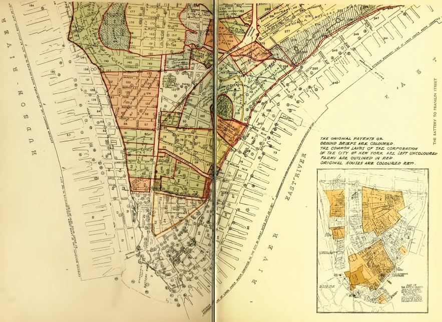 The map of the original patents or ground briefs, with the farms outlined, on the southern point of Manhattan, what is today known as wall street.