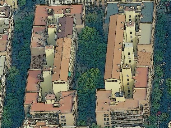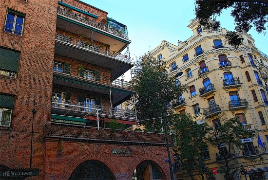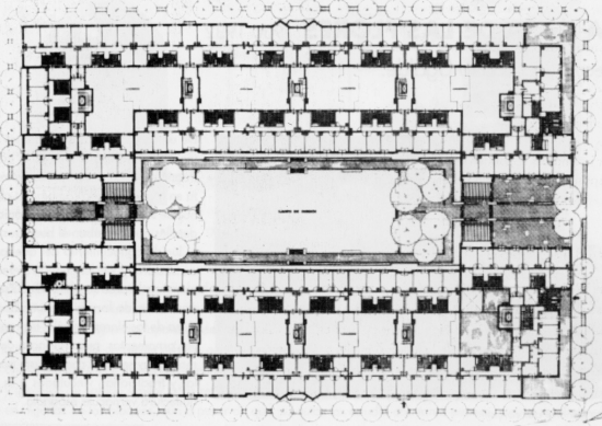 In 1931 Secundino Zuazo designs the Casa de las Flores (house of flowers), a city block in the Gaztambide neighborhood in Madrid, with 288 dwellings in 5 storey blocks. It is a project quite similar to the Habitations a Bon Marché in France during the same period, or some projects in Germany and Austria that also intend to open the courtyards towards the city to improve ventilation. But here there are also smaller courts supplementing the large central one, as no dwelling opens simultaneously to the large courtyard and the street.