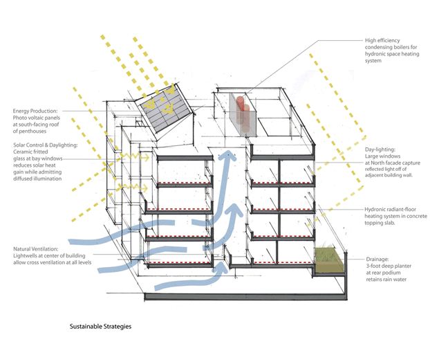 This building in San Francisco, by Kennerly Architecture and Planning (2009), groups 8 apartments (7 of some 90 sq m and 1 of some 66) in a small lot of the urban core. The volumes recall the traditional bow windows of the city.