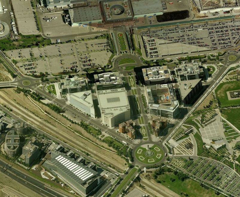 The area is also the location for the IFEMA fair compound, which generates most of the activity (being near the airport has helped, and there is a subway link to the airport and to the central city through Azca), and also the location of an office base; a part is on the entry to the fair and a sizeable part on a narrow strip between rail and the M-40 beltway. The floor area includes 478.000 sq m of parking, 363.000 sq m of offices, 64.523 sq m of dwellings (quite far from the former), 53.000 sq m of hotels and restaurants, and 3.900 sq m of retail. The most interesting architecture is that of the fair (in its gigantic lot there are 590.000 sq m of floor area), but they are not really related to the public space; the Juan Carlos I park represents the Spanish landscape design of the 1990s, and it is by far the most used public space in the area, with most people coming by car, as it is surrounded by infrastructural barriers; it is a good belvedere on northeastern Madrid.