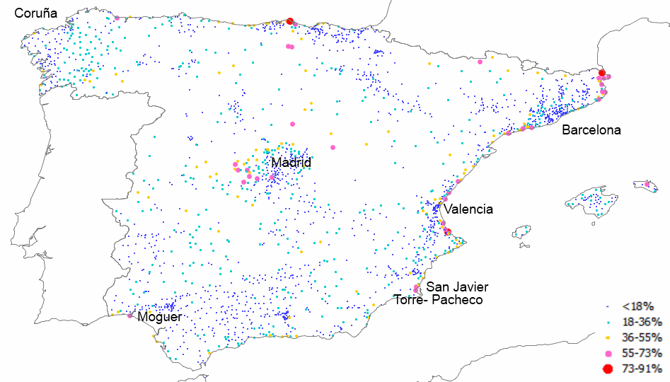 San Javier, in the Murcia region, is the Spanish municipality with the higher seasonal housing ratio. In a grand total of 39.554 housing units, in 2011 up to 23.365 were counted as seasonal. In fact, along most of the Spanish Mediterranean coast, out of the large metropolitan areas, it would be difficult (were it not by the census bureau rules) to tell which homes are vacant and which are seasonal; taking into account the travelling habits and the personal life paths of many north Europeans living in the area for long periods during the year, the idea of permanent residence itself could be a little fuzzy.