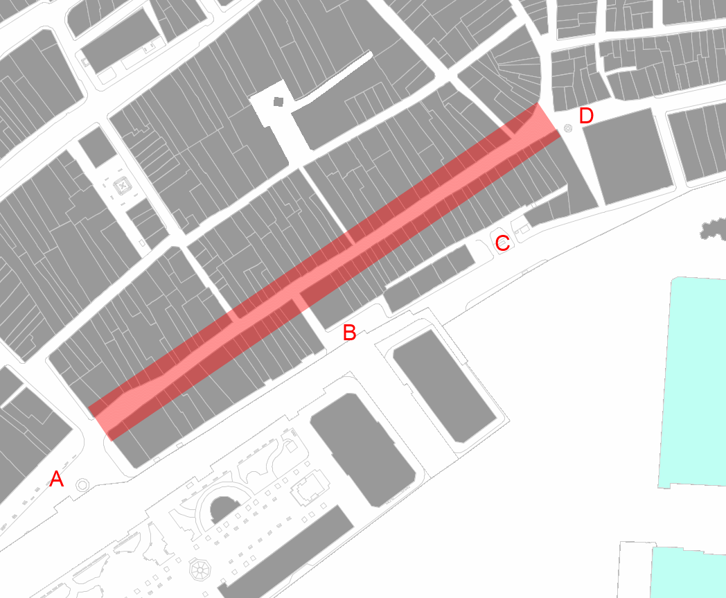 The architectural uniformity is rather maintained in the central section, but there have been relevant changes to the west (A). The paving, made of large granite slabs (that can give you “downside up rain” on rainy days if they move…) is still there. It is a pedestrian street, but for deliveries to retail, as many of the surrounding streets, not only by regulations, but also due to their dimension (and the lack of garages in such narrow lots…)