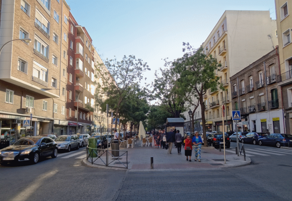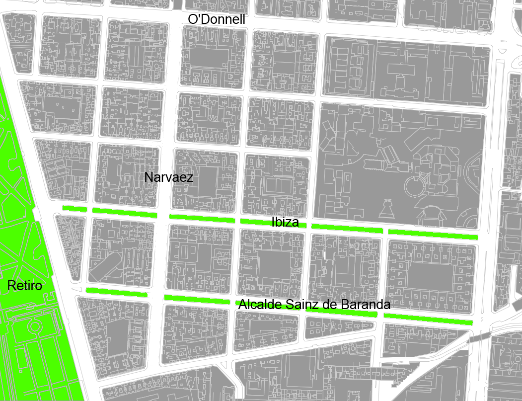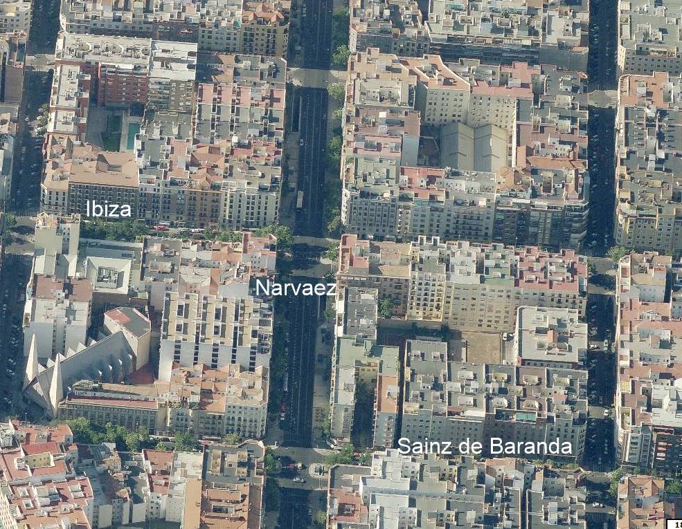The title is about streets, not the island… With a total length of 720 m and a width of 30 m, lateral sidewalks slightly over 2 m, and a central promenade of 11 m, Ibiza and Sainz de Baranda streets are an interesting case. They have the same overall width and the same kind of building that Narvaez, their perpendicular street, has. They connect the Retiro, the grand central park of Madrid, and as they have central promenades they have a certain number of cafes and restaurants. The whole neighborhood is reasonably served with retail (not a magnet for shoppers as some blocks to the north, but not the worst area in the city either). But the more retail looking street is Narvaez: despite giving more space to the car, it gets up to the department stores in Goya- Felipe II, sidewalks are wider (some 5 m) and, probably, the fact there are less trees “distracts less” the pedestrians, that so can focus on the shops on the opposite sidewalk (essential…).