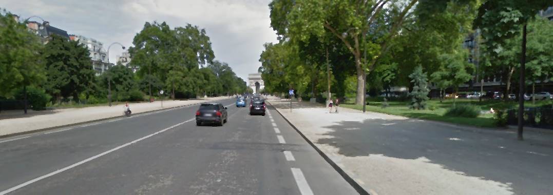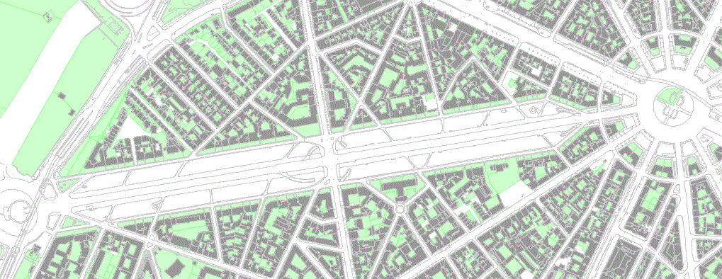 1, 3 km long, 140 m wide: can to much width kill the street, even in an utmost posh Paris location?. Green indicates private owned non built spacesCentral road: few intersections, a substantial distance to buildings, so it is somehow like a freeway…Lateral alleys: so much distance to the other side, hard to call it the same street.