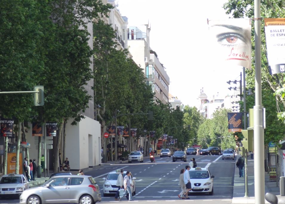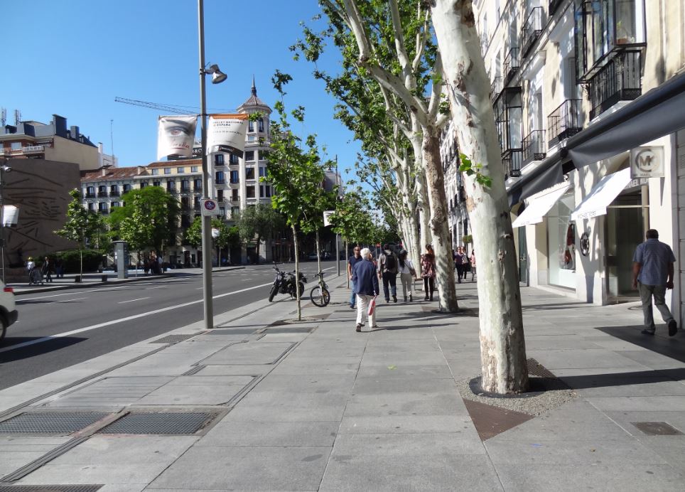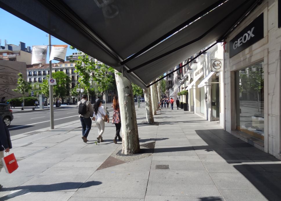Serrano is one of the thoroughfares of the barrio de Salamanca, the Madrid extension of the XIXth century which is today one of the most powerful central areas of the city in economic terms and as an icon. It is a street in which choice, selected goods (apparel, shoes, luxury) shops flock, as well as high end office space. Its location near the Castellana, but with a width substantially better for retail and other activities, and the presence of an also sizeable retail base in adjacent streets, from the luxury of Ortega y Gasset to more stratified price ranges, lead to a concentration that can be compared to that of a large edge-city mall. One of the most interesting sections, even if asymmetric (no buildings to the west) is that of Plaza Colón, which concentrates some of the most exclusive shops (ant the images of this post).