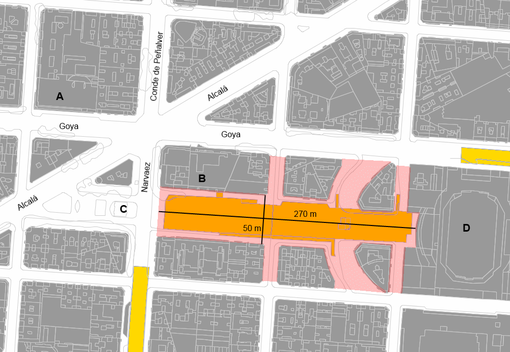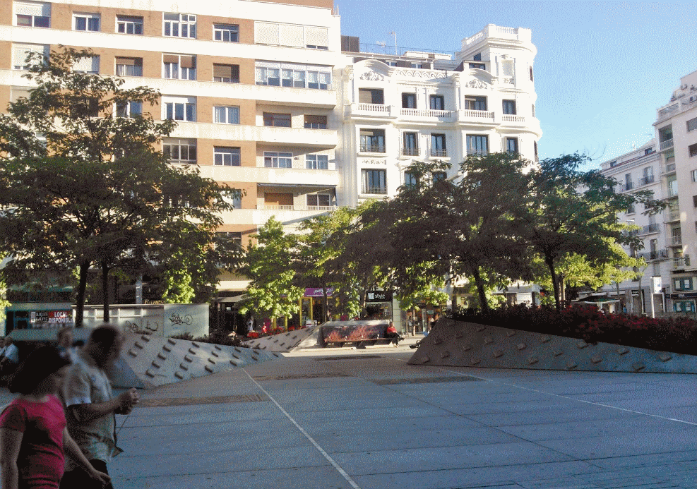 With an underground parking the square could only have trees on the sides; this is not really something strange in the Castillian culture, but in fact the Madrid summer made it a hard space to live, in a location so close to a huge retail centrality which is very well connected (public transportation hub on C on the map). Some 10 years ago there were already talks about the need to civilize that space, and finally a few years ago Patxi Mangado’s project was finished. The paved surfaces were changed, and some trees were planted on the western part, using elevated platforms on the parking slab.