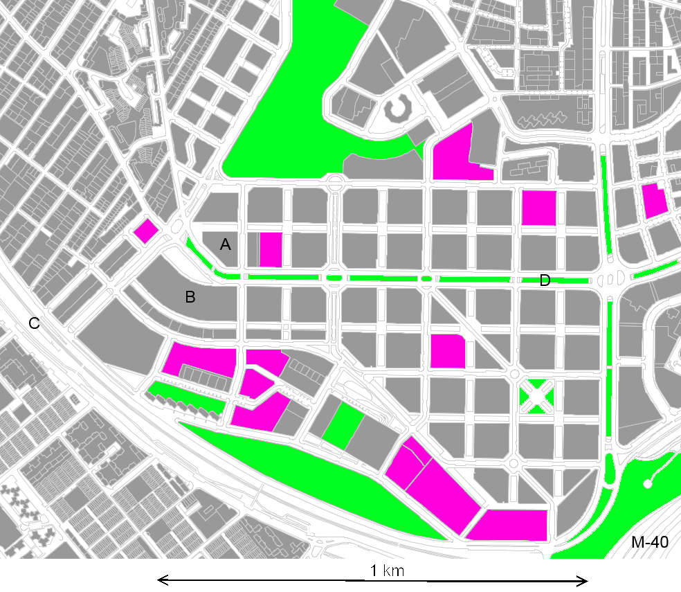 What do all shantytowns would like to be when they grow up? a formal city. The shantytown of Palomeras Bajas, appeared during the large migrations to Madrid (1950s-1960s), was transformed during the 1990s into a middle class new neighborhood in which at least a part of the original population was relocated. The regional Parliament (A) was relocated to the area, facing a mall (B), near a revamped train station (C) and well linked to other new areas through Avenida Pablo Neruda (D).