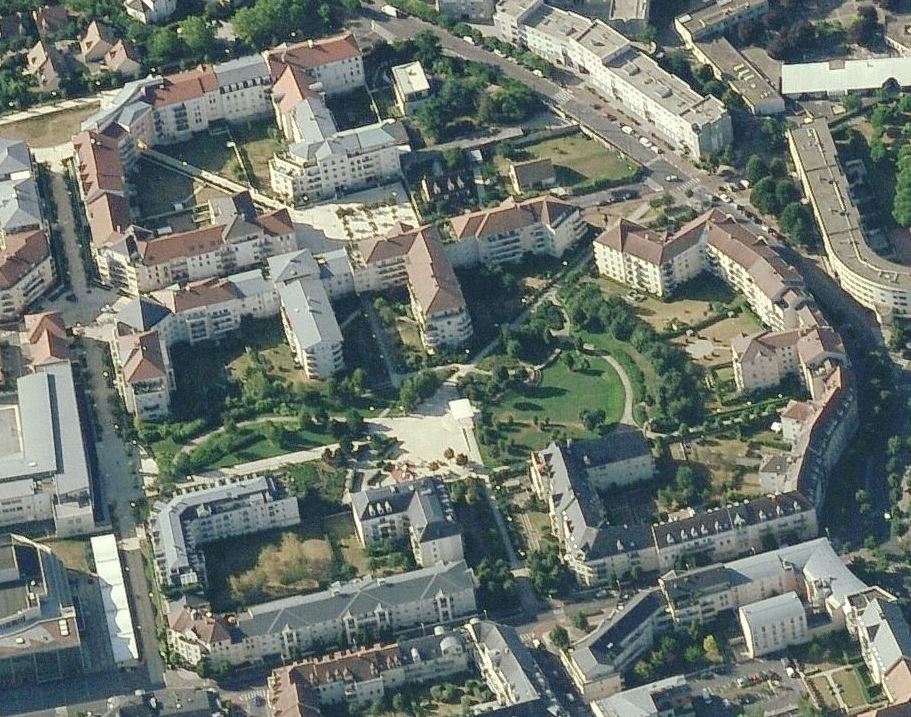 1906. Noisy le Grand, some 13 km east of ParisNowadaysA new, somewhat artificial, combination of city block and open blocks, in a wider urban core project for a metropolitan municipality. Almost exclusively housing, but by the market square, near supermarkets and a big regional mall