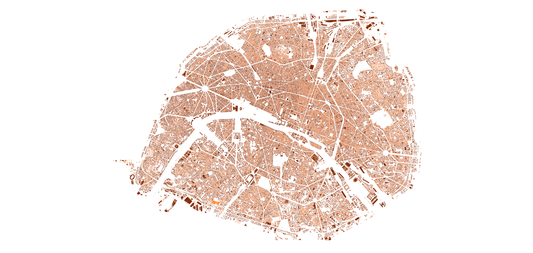 This is a map of Paris in which the darker colors represent the higher built-up areas in buildings, according to Paris open data. This is not a building density map (you can have a big building surrounded by a large park, so density would be reduced), but rather, following what was in the last “biblio” about climate change in Paris, a map of big energy bills. So during the next days this will be the issue: big buildings, which in turn mean big energy and ressources consumers under a single management, which means (perharps) chances to go greener.