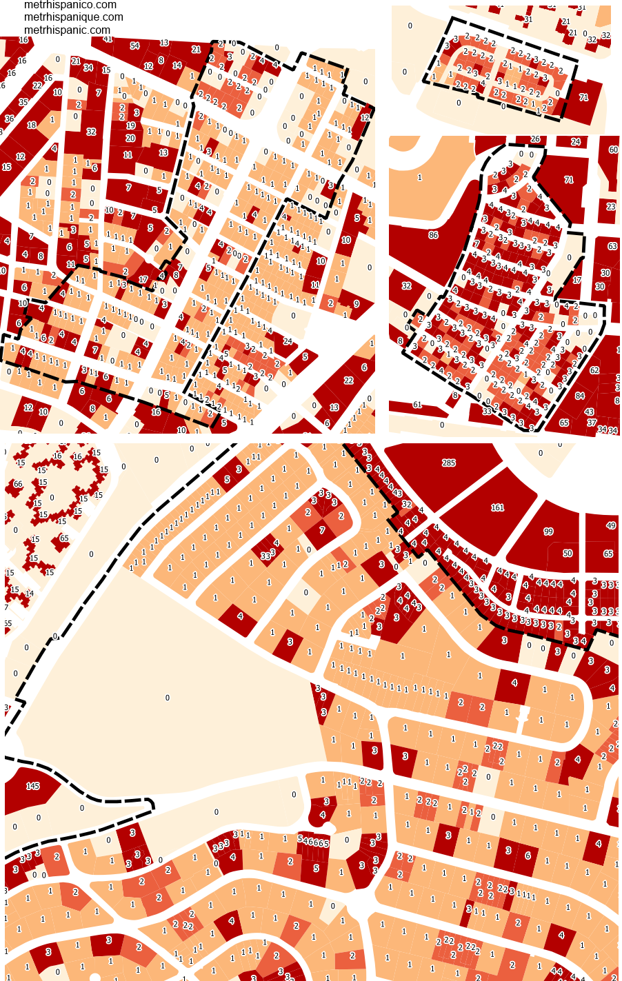 Let’s come back to the inception of this series, the question raised on monday by biblio (66): has there been or not a residential densification in these neighborhoods?. Cadastral data (upper image, with all the subdivisions at the same scale, displaying the number of residential assets by lot) can be misleading, as in some cases built elements are not properly coded and there seems to be a lack of homogeneous criteria (at least from an urbanist viewpoint, just remember cadastral data is used to levy taxes). Sometimes ancillary elements as a pantry are inscribed as separate elements, but no one would say they are dwellings from a common sense approach. Just trust me, there has been some densification, but to have a better measure it will be better to wait until the release of the new census data in december.
