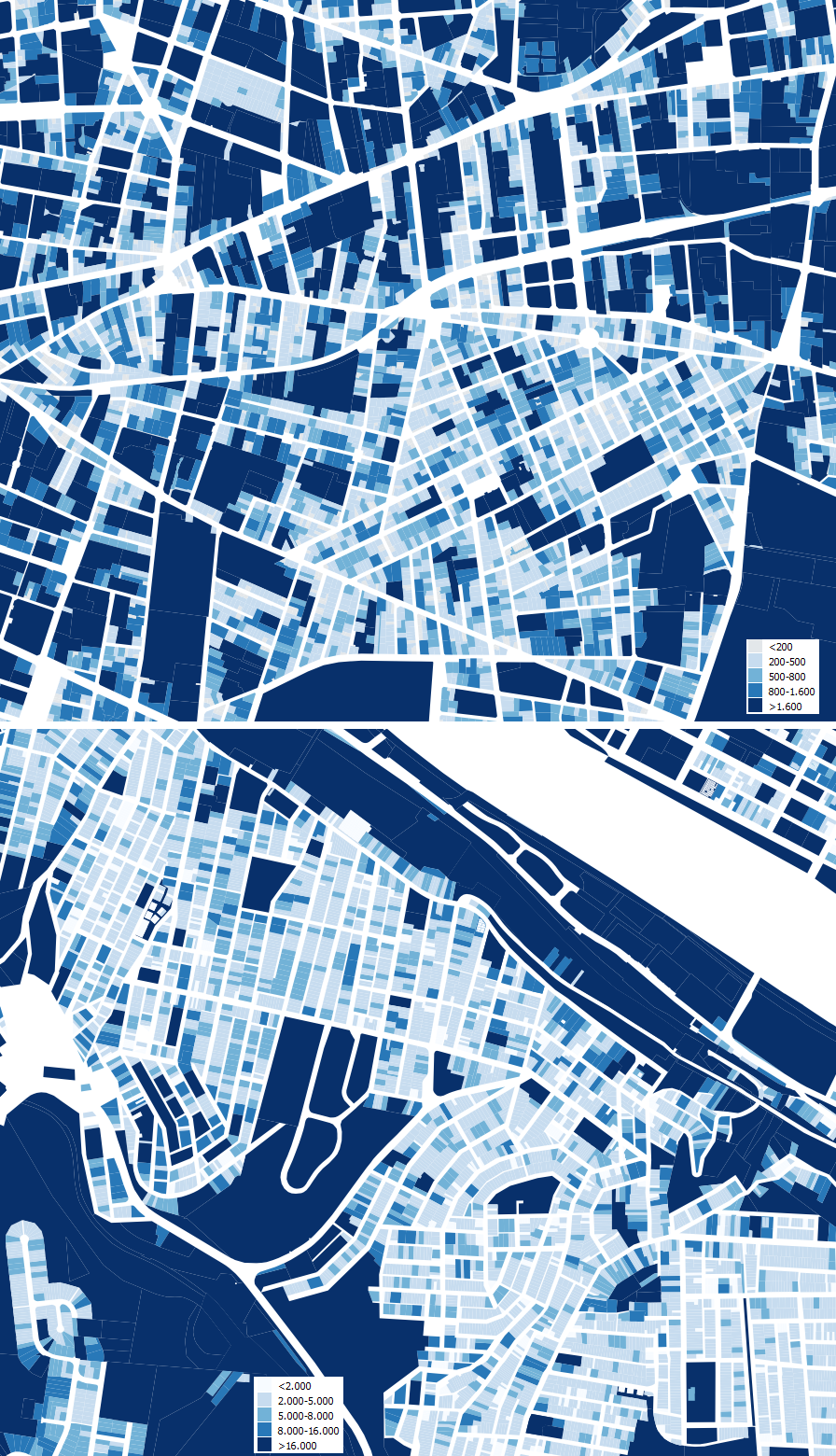 That’s the kind of comment that usually rises a few (malevolent) smiles: size matters. When talking about lot area (relevant as it defines the size of the buildings in plan, and so the urban image), these two cities that have so much in common in “social size” (population at different scales, albeit on rather different physical footprints), show a thing or two. Lyon’s parcels are rather fine when compared with central Pittsburgh, a more recent city in which corporate headquarters and such american features as open air parking (sure, less pervasive than in Houston) change the city. Therefore, a clear difference in “resolution” exists, besides the evident difference in architecture.