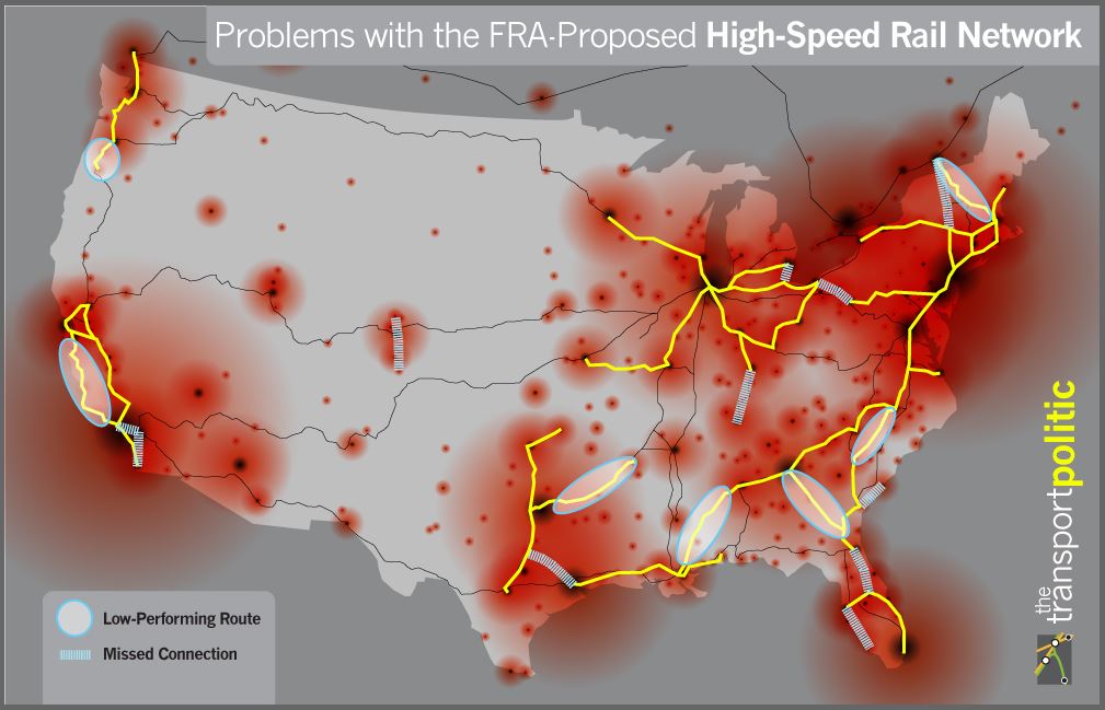 A clear schematic layout which criticizes federal plans for the high-speed train national network in the USA. Good use of yellow (not always easy), of density rendering. The result is fit for the web. The original can be consulted on http://www.thetransportpolitic.com/2009/02/19/stopping-the-wrong-project-before-it-happens/ , with some comments that can also be applied to other geographical contexts. As often, a…