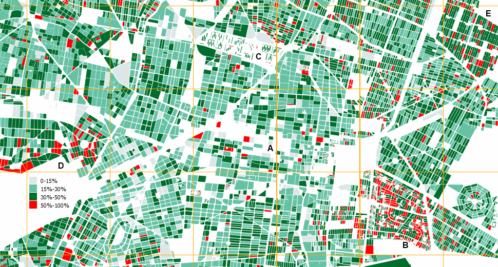 In central Mexico City the families in which the head (in the census sense) is 60 or over are clearly a minority (the orange grid is 2 km). The historical core around the Zócalo (A) has very few, just the opposite of most European historical cores. There are areas as colonia Jardín Balbuena (B) or Rincón del Bosque (D) which have high family incomes, where older family heads are more relevant. Colonia San Juan de Aragon (E) has also a relevant share, but their situation must be different, as this is not an affluent area. The Tlatelolco area (C), one of the high symbols of the Mexican social housing architecture, has a rather reduced presence of such aged family heads, even as its building years would be in many countries a pre-requisite for an aging population. Anyway, these results are limited to the age of the head of the family, so there can be more data to analyse.