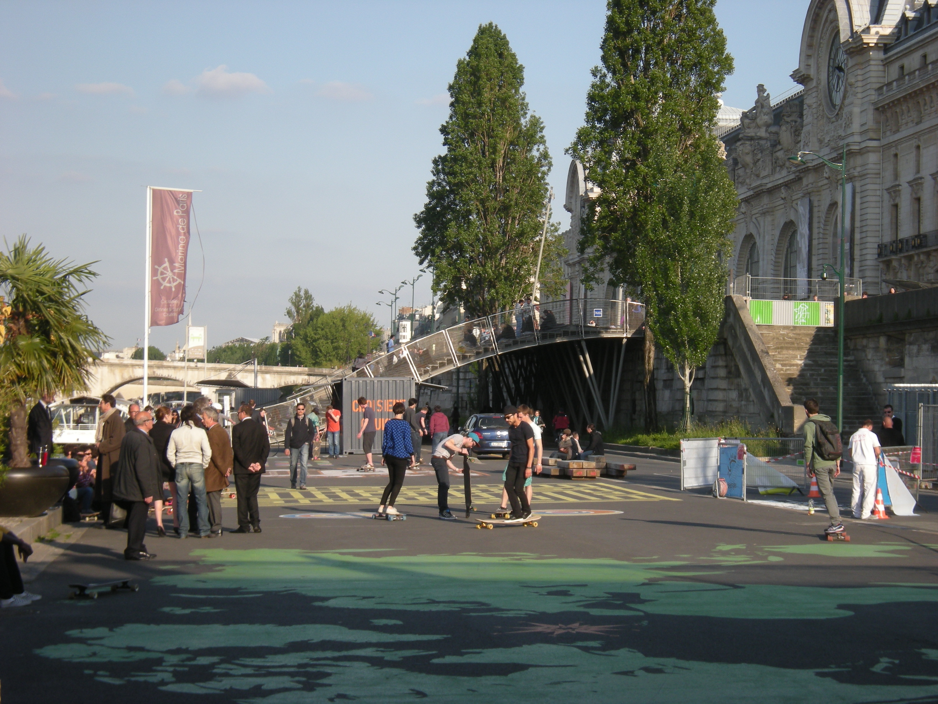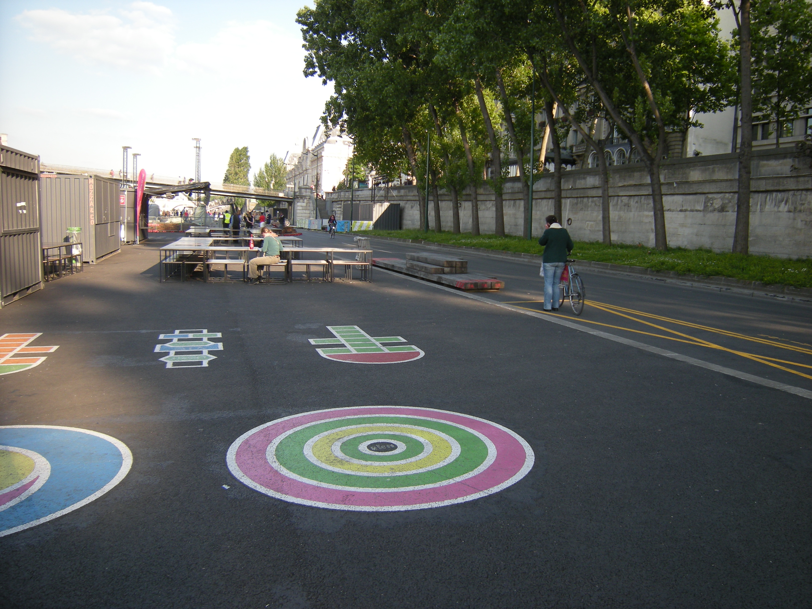Madrid has chosen to bury the freeway under its former site, creating a new public space project on a much larger scope. Paris has not substituted the eliminated car space, and the asphalt has not been removed; it has become a platform for varying uses, as a tv set in some way. The cost is much lower, and the use more flexible. Doubts can rise on whether this is a more or less ambitious scheme, but it seems more sustainable.