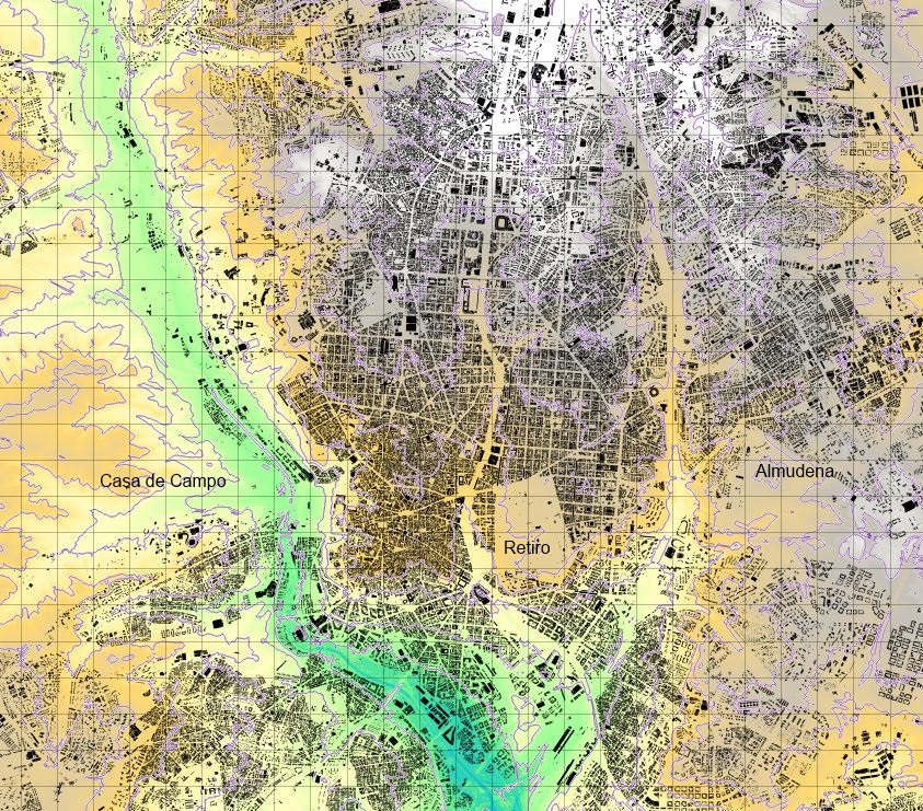 Any large city can have a complex setting, altough it is not compulsory (just think of the Randstat, Shanghai or New Orleans). Madrid has a certain terrain complexity, defined by the Manzanares (a quite tamed river), and the Abroñigal and Castellana creeks; Abroñigal is nowadays a corridor for the eastern M30 beltway and Castellana is the main north-south spine. The historical city began on the steep slopes of the eastern shore of the Manzanares, to later grow towards the east.