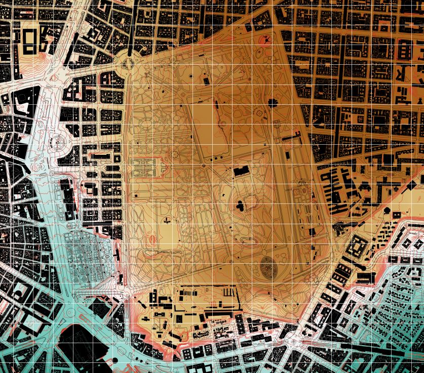 The Texeira map shows that garden as related to an essential part of its ensemble, the Palacio del Buen Retiro, now disappeared (not unlike what happens in Paris with the Tuileries garden and the palace that disappeared during the Commune). The Palace was on the natural ramp ensuring a clear link to the city; nowadays the Jeronimos neighbourhood and the Prado Museums compound have substituted it.